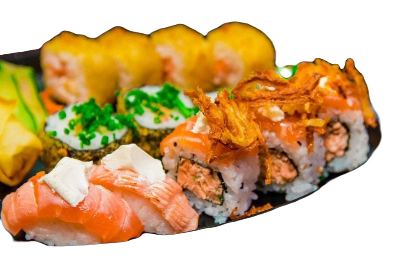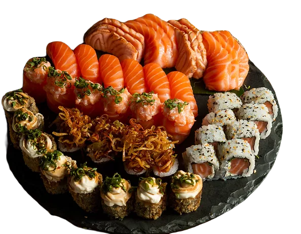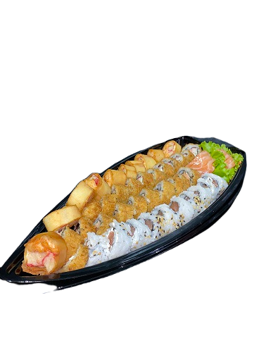 05 sashimi de salmão, 05 sashimi de kani, 10 uramaki Filadélfia, 10 hot camarão, 10 hot harumaki