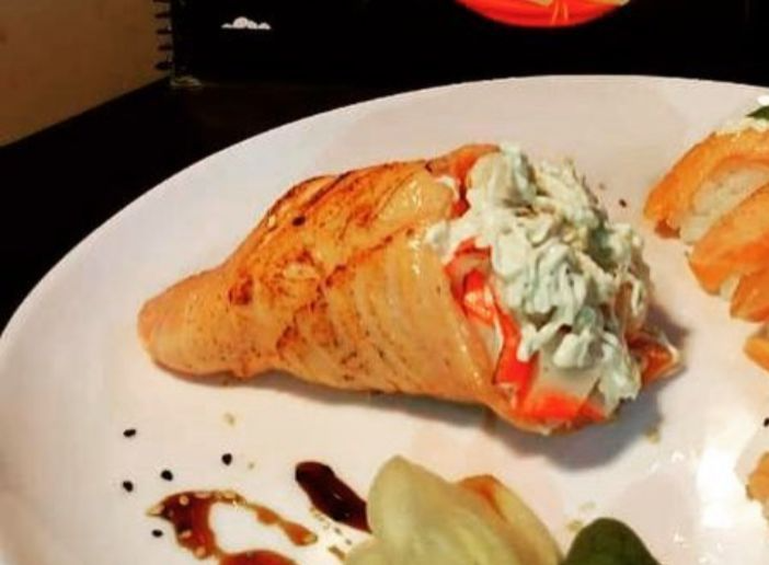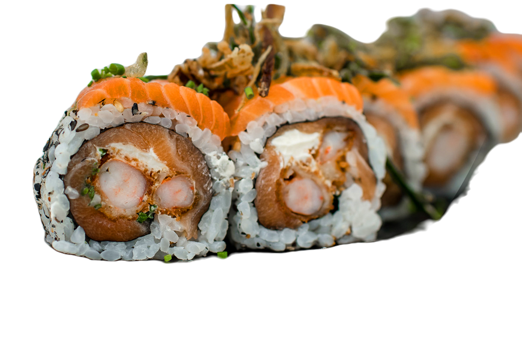 Salmão flambado, Camarão, Kani, Salada e Cream Cheese